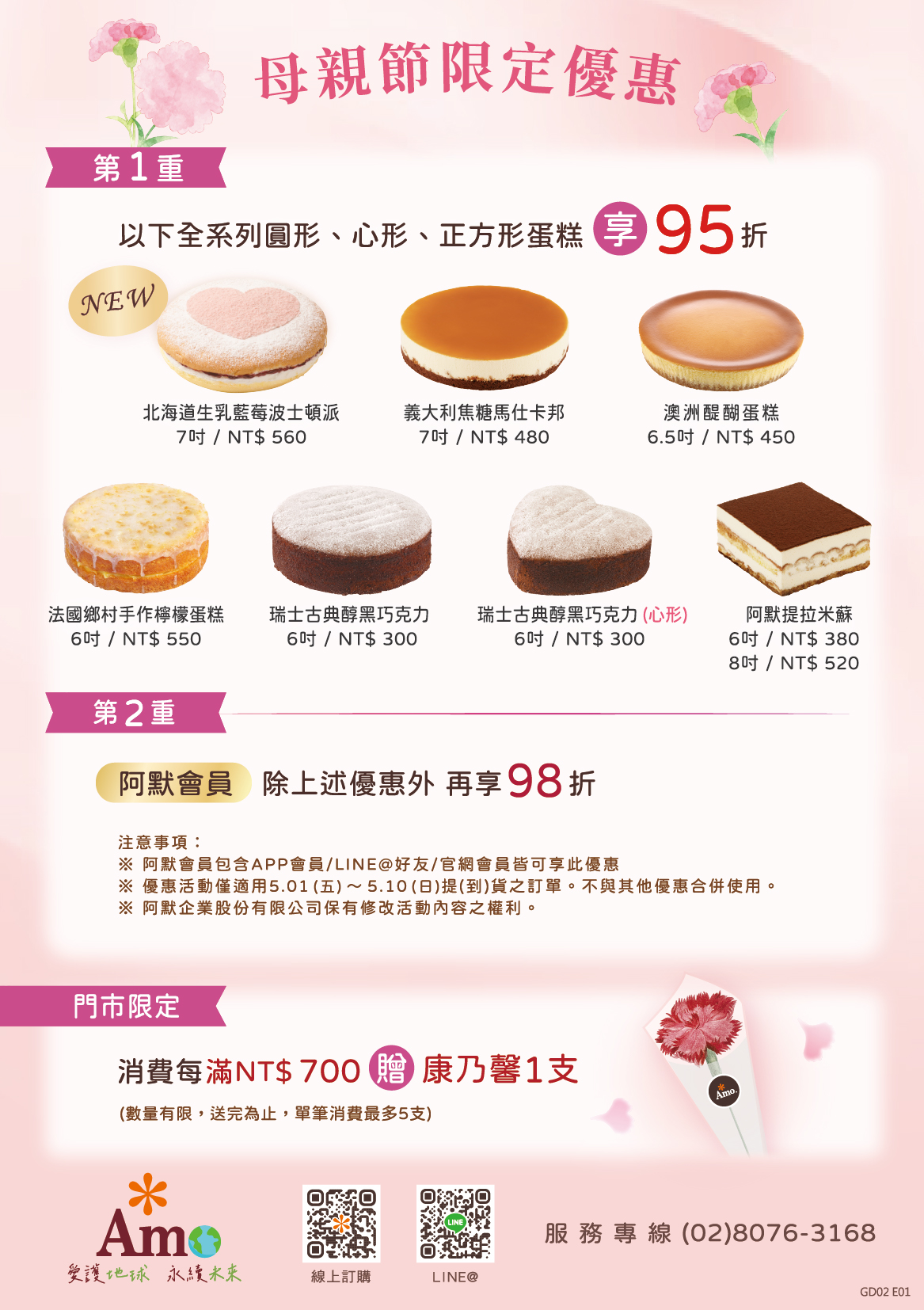 活動期間內於門市消費每滿 NT$ 700,即贈送康乃馨乙支(數量有限,送完為止,單筆最高贈送 5 支)。