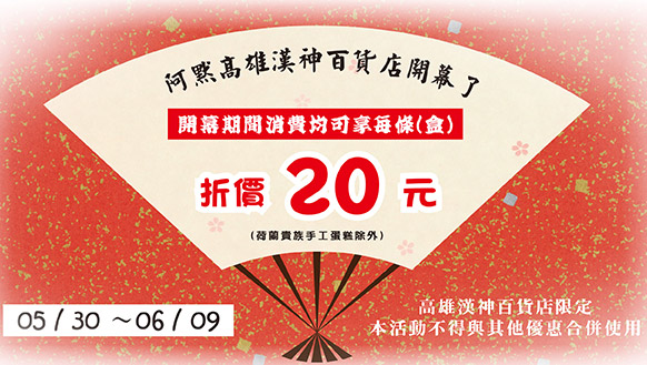 現在從05/30到06/09開幕期間消費均可享每條(盒)產品折價20元的優惠喔 (荷蘭貴族手工蛋糕除外)